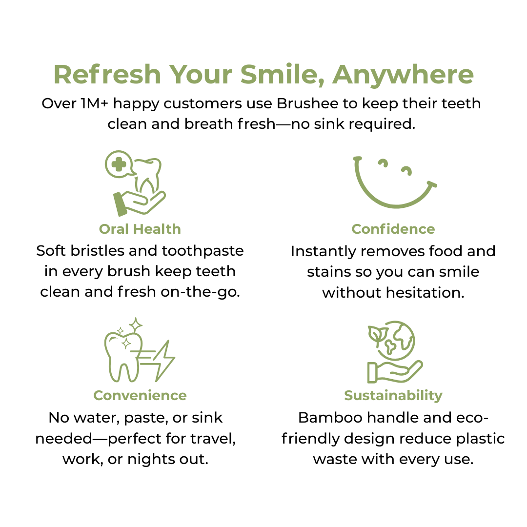 It can be hard to maintain proper oral care on-the-go. And everyday consumption of common goods such as coffee, ketchup, red wine, and cigarettes can make it difficult to maintain a big beautiful smile. So the Brushee was our way of helping you maintain a big confident smile and healthy oral care on-the-go.